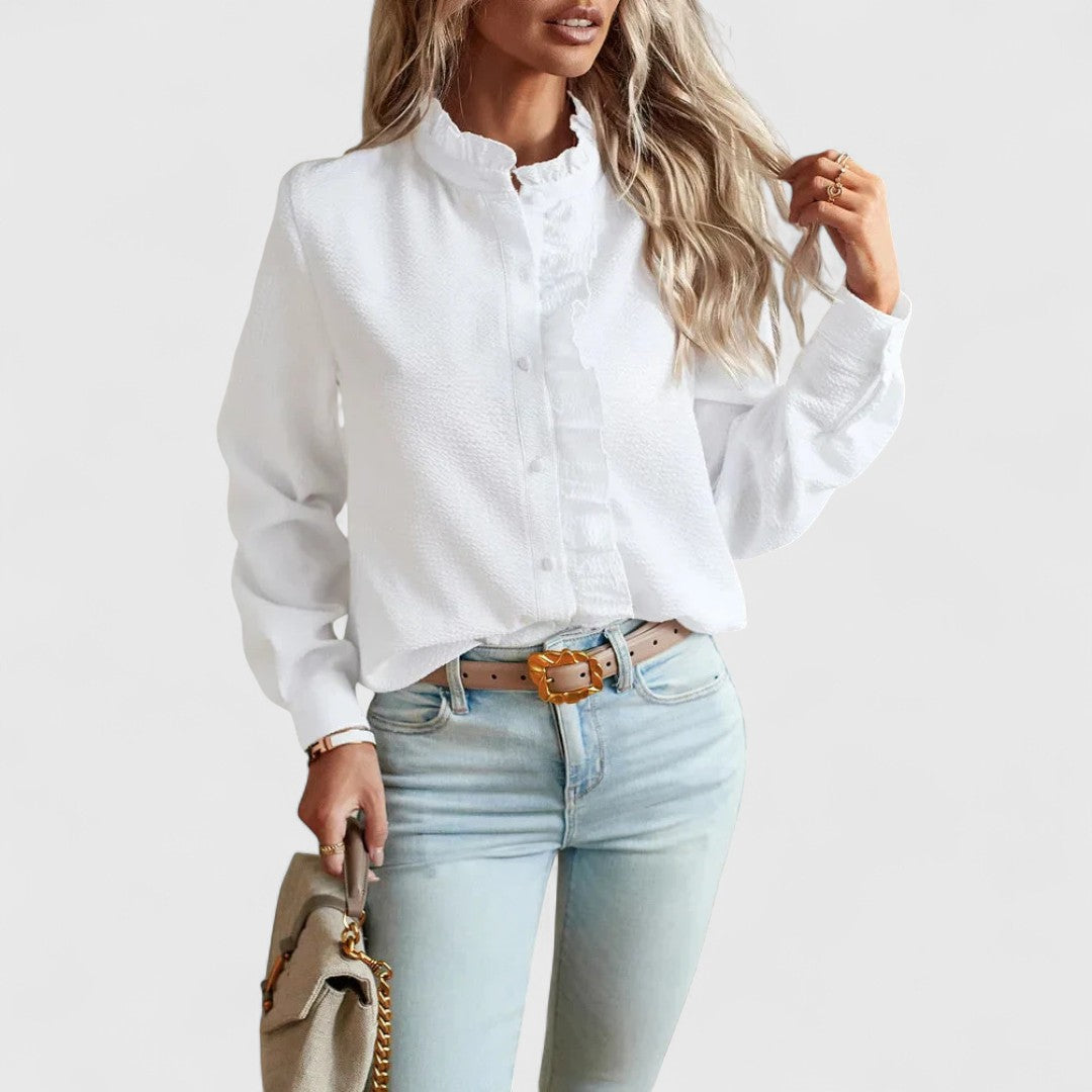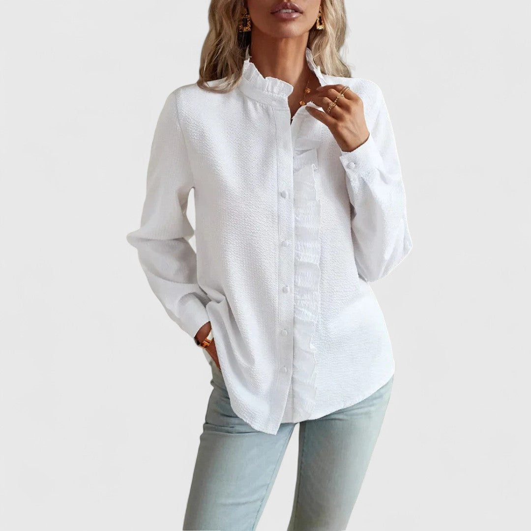 • Διακριτικό βολάν στα κουμπιά για ρομαντικό, διαχρονικό ύφος.