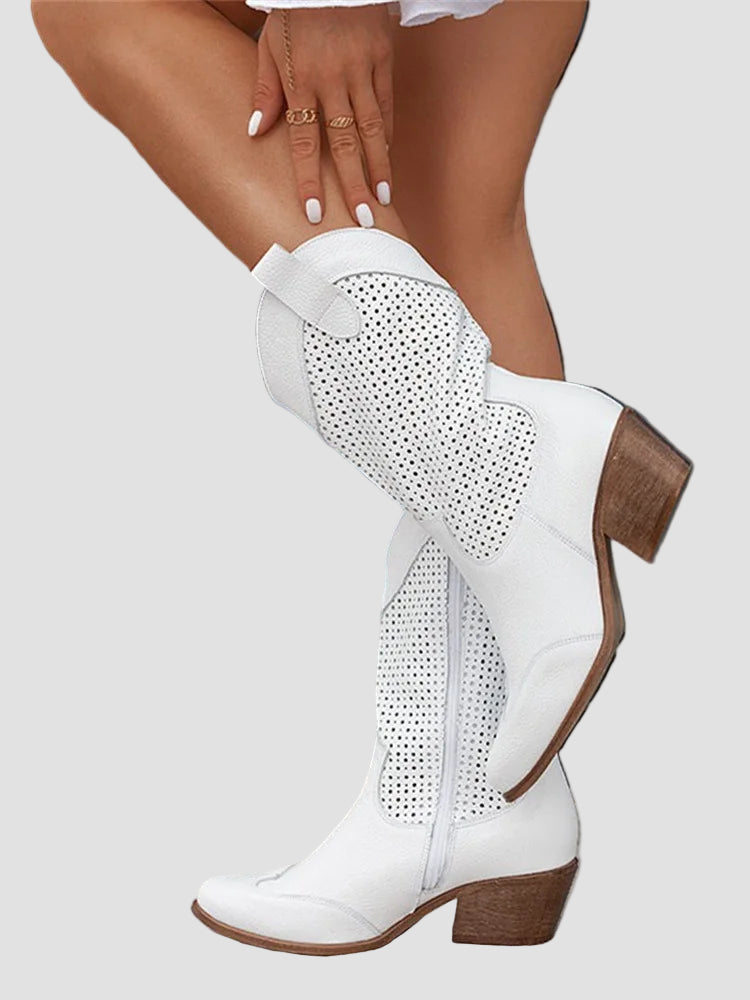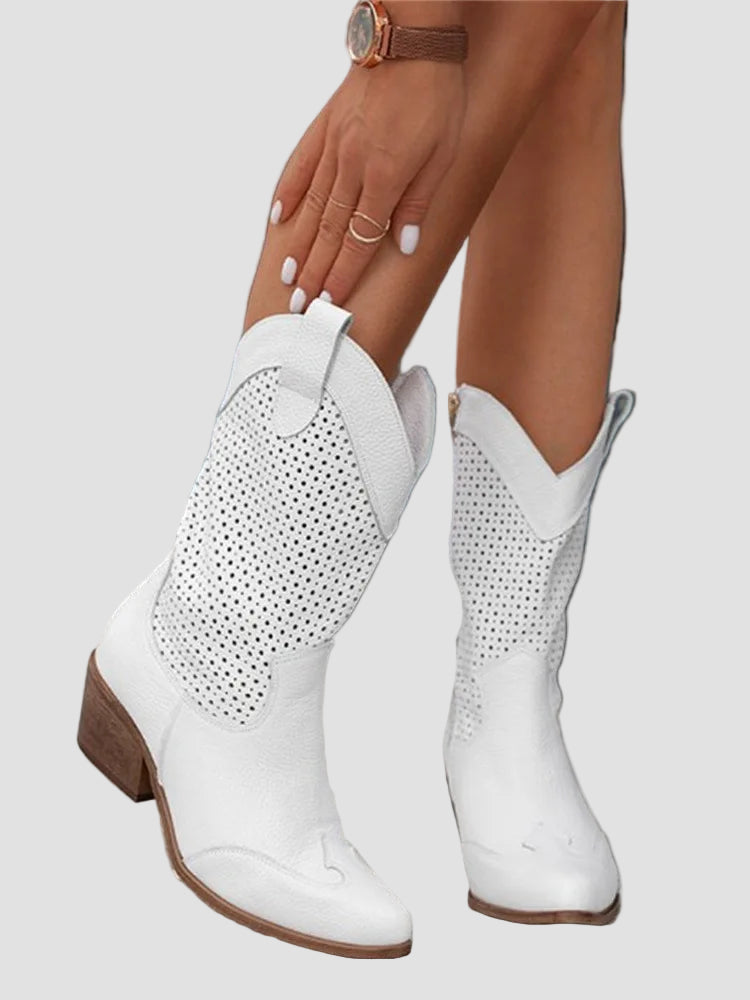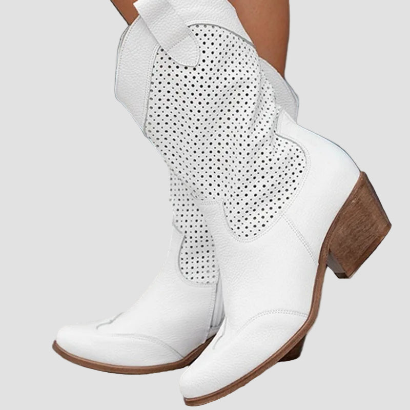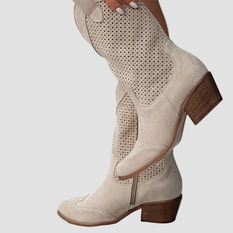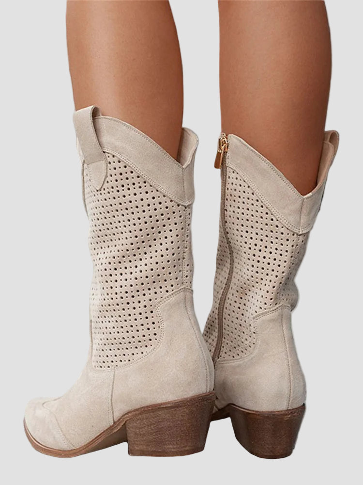 • Estilo Western Arejado e Atual: O design de camurça perfurada (microfuros) não só adiciona uma textura elegante και um detalhe único, como as torna perfeitas para usar nas estações de transição, não apenas no inverno.