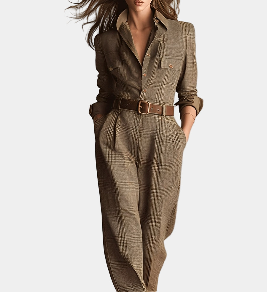 Καφέ φόρμα με υφή και καρό σχέδιο, πρακτικές λεπτομέρειες και κομψή και λειτουργική εμφάνιση, τόσο για τη δουλειά όσο και για ένα στιλάτο καθημερινό look.