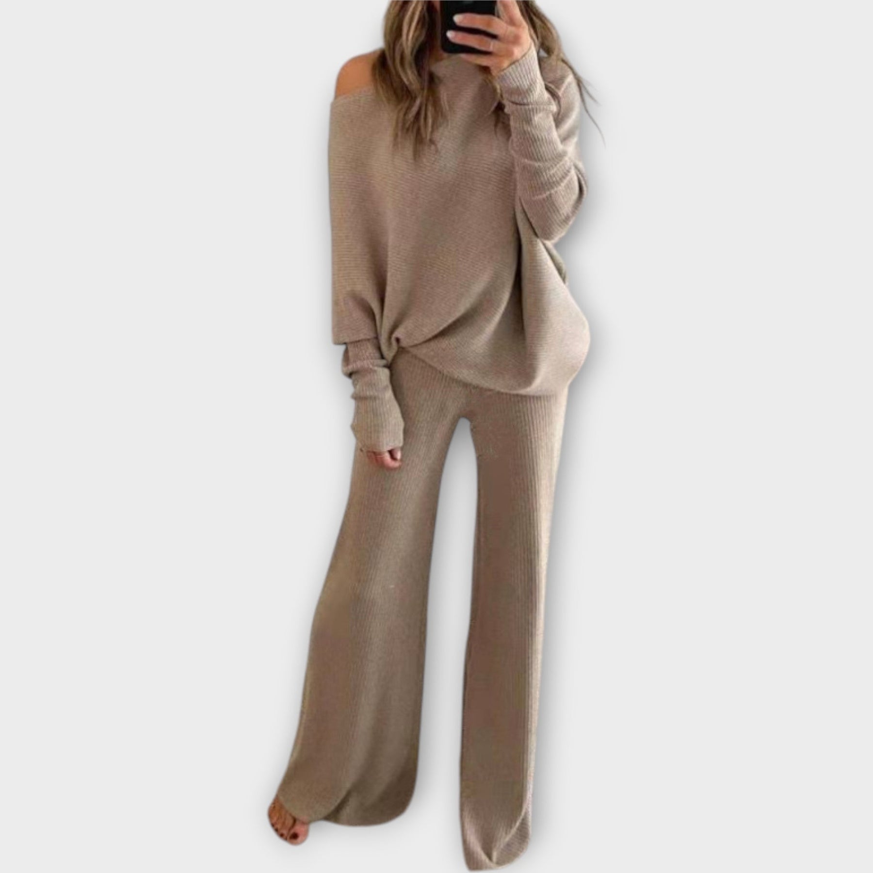 Ένα πλεκτό σετ που συνδυάζει άνεση και διαχρονικά στυλ. Το χαλαρό πουλόβερ με ανοιχτό ώμο προσφέρει μια κομψή αλλά ανεπιτήδευτη εμφάνιση, ενώ το φαρδύ παντελόνι χαρίζει ελευθερία κινήσεων και σικάτη σιλουέτα. Μαλακό και ευχάριστο στην υφή, είναι ιδανικό για καθημερινές εμφανίσεις αλλά και στιγμές χαλάρωσης.